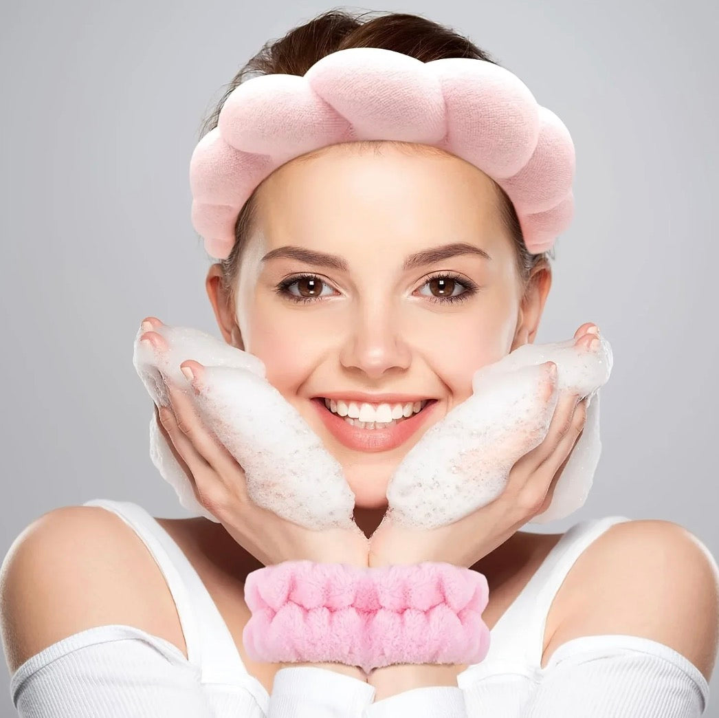 The 3Pcs Wash Face Headband Set includes a plush sponge headband and matching wrist straps — designed to keep your hair dry and water-free while washing your face or applying makeup.